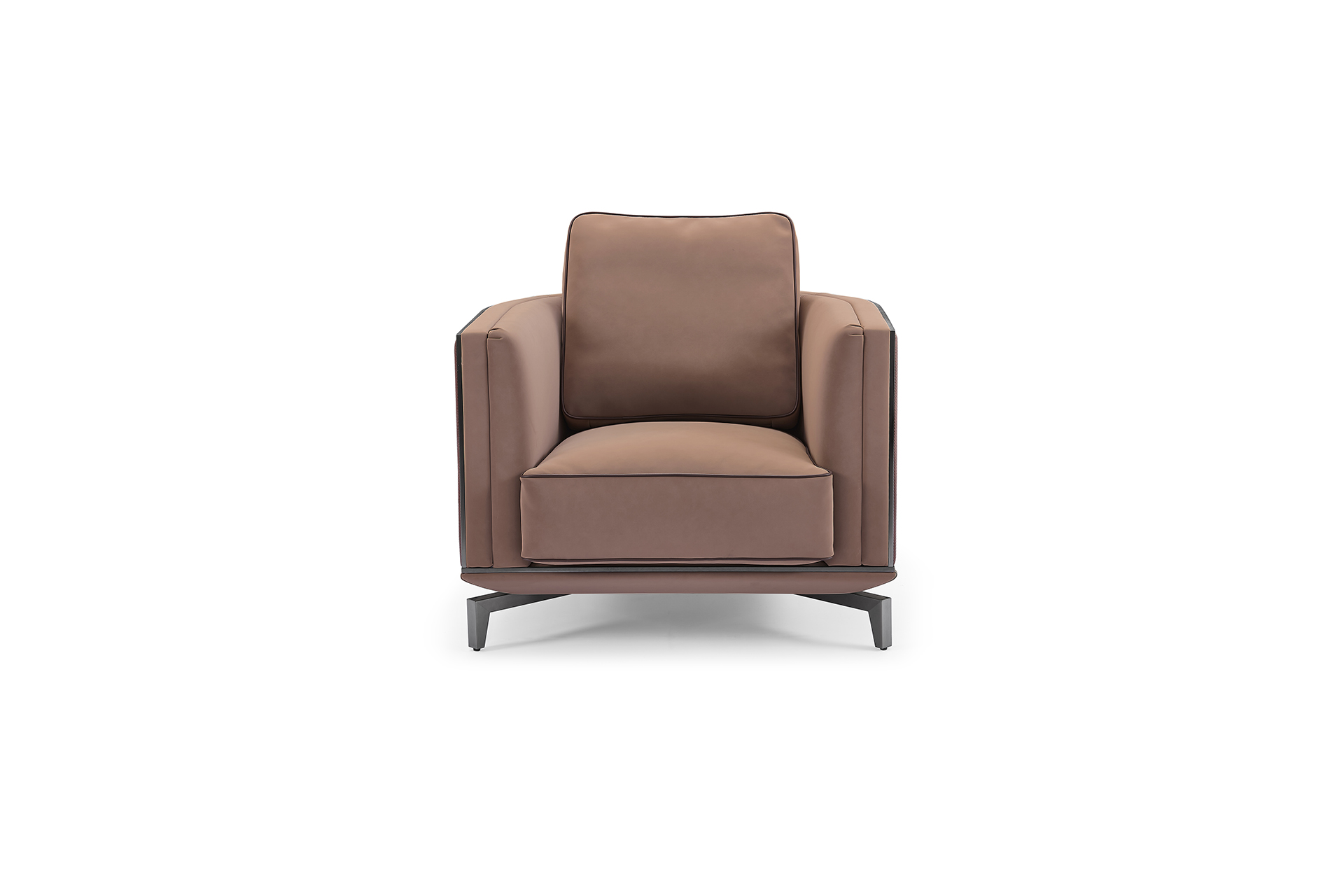 材质: 主材:实木俄罗斯松木+实木多层板 填充物:高弹密度海绵 脚:不锈钢拉丝黑钛框架 面料:磨砂超纤:主色:CF5-17 西 皮:股条:CA1-41 装 饰 皮:AA1-01